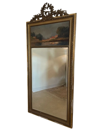 ANTIQUE FRENCH LOUIS XVI TRUMEAU W/ FLORAL & RIBBON CREST. 65 X 29.5"